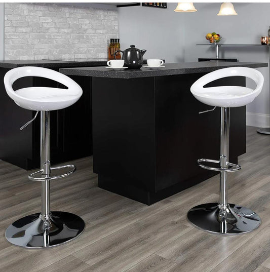 White Adjustable Height Barstool - Kshs 9999/- ✓ with Rounded Cutout Back ✓ Chrome Base ✓ White color Description Elevate your kitchen island or bar area with this striking adjustable barstool, blending modern aesthetics with functional design. The crisp white, ergonomically contoured seat provides comfortable support and features a...
