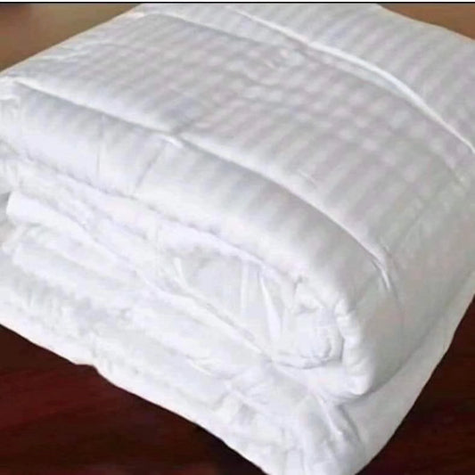 This is a complete three piece white bedding set featuring a lightweight duvet comforter, a fitted or flat bed sheet, and two matching pillowcases. The duvet is generously sized at 220 centimeters by 240 centimeters which is approximately six feet by seven feet, making it suitable for most large beds....