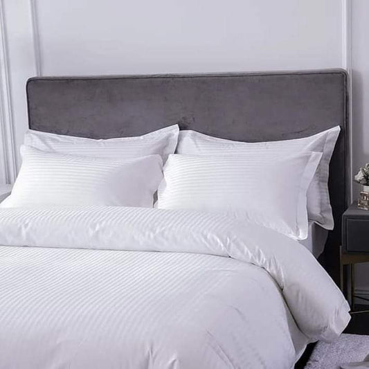 This is an elegant four piece duvet cover set designed to deliver a high end, hotel quality look and feel to your bedroom. The set is sized for a six by seven feet bed and includes one duvet cover, one coordinating bedsheet, and two standard pillowcases. Featuring a subtle stripe...
