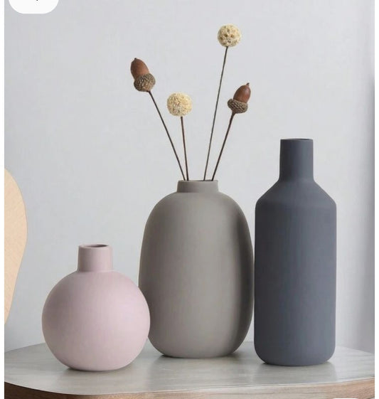 This curated set of three vases features a simple, elegant design with modern, muted colors, providing a sophisticated accent for any space. Each vase boasts a distinct shape and a smooth, matte finish in coordinating contemporary shades of dark gray, soft pink, and neutral gray. They are perfectly sized for...