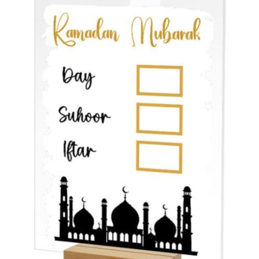 Description This daily tracker provides a clear way to organize essential times during the holy month. The upright display is crafted from white acrylic and features a steady wooden base for secure placement on flat surfaces. It includes dedicated spaces to note the current day alongside specific times for Suhoor...