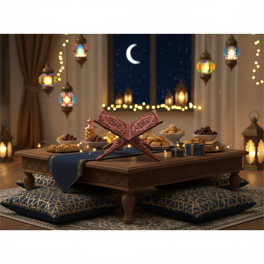 Description This wooden display rack provides a dedicated and respectful space for holding religious texts during study or prayer. The stand features a traditional folding design that allows it to hold books at a comfortable angle for reading while seated. Each piece is decorated with detailed cutout patterns and traditional...