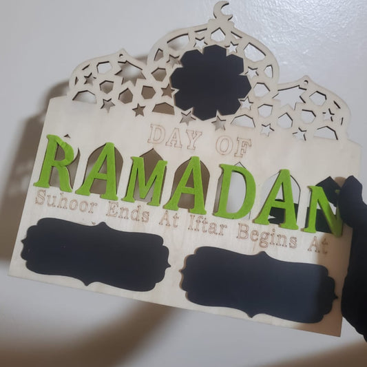 Description This hanging wooden sign provides a practical way for families to track fasting schedules and the progression of the holy month. The board features a mosque silhouette top with intricate star cutouts and vibrant green lettering that stands out against the natural wood grain. It includes three dedicated chalkboard...