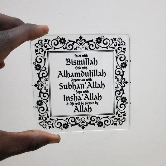 Description This square desktop plaque provides a constant reminder of faith for your daily life. The design features important phrases of remembrance including Bismillah, Alhamdulillah, and SubhanAllah arranged in a clear central layout. A detailed floral border surrounds the text to provide a complete and balanced look for your tabletop....