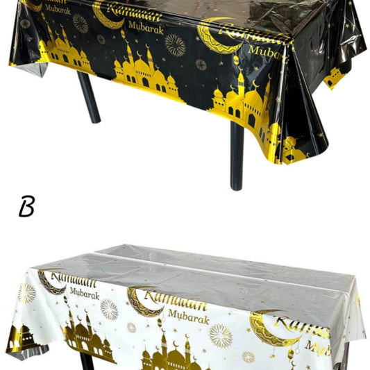 Description This plastic table cover provides a festive foundation for your holiday meals and gatherings during the holy month. The design features a bold contrast of gold illustrations against solid backgrounds, showcasing traditional mosque silhouettes, crescent moons, and stars. It is crafted from a water resistant material that protects your...