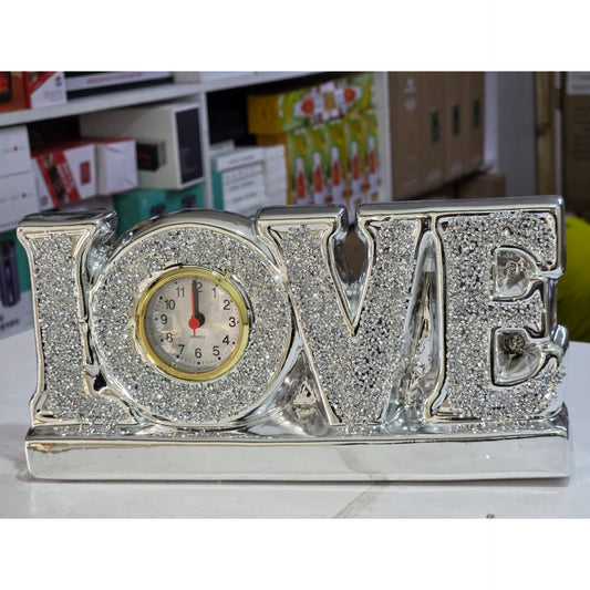 Love Tabletop clock sparkling decorative timepieceGlamorous silver-tone finish with glitter embellishmentsBuilt-in analog clock with quartz precisionSymbolizes warmth,affection and timeless eleganceIdeal for home decor or romantic gifting