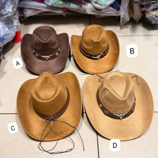 Step up your look with thiis bold,Western-style cowboy hat, perfect formaking a rugged fashion statement. Craftedfrom high-quality suede-like material, thehat features a timeless pinched crown andwide, curved brim.A detailed band, completewith a striking longhorn bsullhead emblemand metallic accents, wraps around the base,highlighting its authentic style. Thisaccessory is designed to enhance...