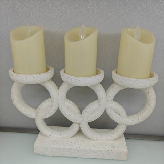 Description This ceramic candle holder features a unique design of five interlocking rings arranged to support three individual pillar candles. The piece is finished in an off white tone with subtle red speckles that add a natural and grounded feel to the surface. It sits on a solid rectangular base...