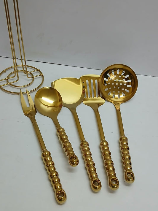 6 Piece Gold Serving Spoon Set with Stand This comprehensive kitchen tool set provides a coordinated collection of essential serving utensils for daily meals and special gatherings. Each piece features a bright gold colored finish and a textured ceramic handle that ensures a comfortable and secure grip during use. The...