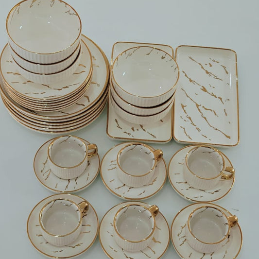Description This comprehensive porcelain collection features a striking white base accented by gold colored marble veining across every piece. The set provides a complete dining and beverage service for six people, including specialized rectangular platters for serving main courses or appetizers. Each item is finished with a gold rim that...