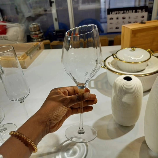 This elegant set of six wine glasses is designed with a striking, diagonally cut rim, offering a unique and modern twist on traditional stemware. Crafted from high-quality clear glass, the design enhances the aesthetic of your table setting, making every occasion feel special. The generous 400ml capacity is perfectly sized...