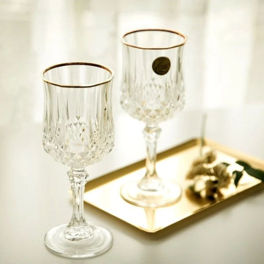Set of 6 Wine Glasses with Gold Rim This set of six glass vessels is designed to enhance the presentation of your favorite beverages during dinner service or social gatherings. The body of each glass features a deeply textured diamond pattern that provides a secure grip while reflecting light beautifully...