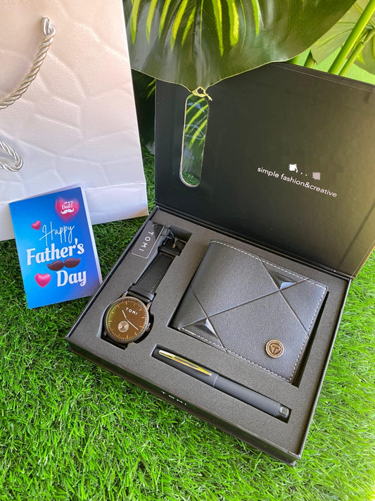 This thoughtful Father's Day gift set is curated to celebrate the important man in your life. The set includes three essential accessories: a water resistant, battery powered watch, an executive pen, and a genuine leather wallet. Each piece is selected for its sleek design and functional quality, making it an...