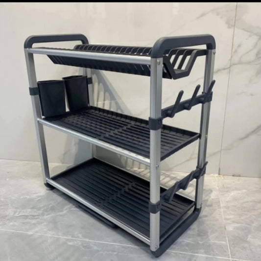 Description This three level drying rack provides a structured system for organizing wet dishes after washing. The aluminium frame resists rust while the integrated drainer board directs water away from the counter to keep the kitchen area dry. It includes specialized sections for plates, bowls, and mugs to maximize drying...