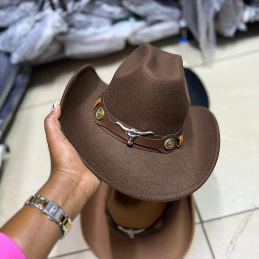 Cowboy Hats Step up your look with our bold Western-style cowboy hats, featuring a striking longhorn bullhead emblem and detailed band accents.