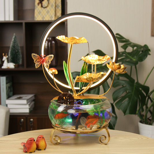 Description This indoor tabletop fountain combines a flowing water feature with a transparent basin that functions as a small fish tank. A large glowing LED ring frames a series of golden lotus leaves that allow water to cascade gently into the base. The design includes decorative elements such as a...