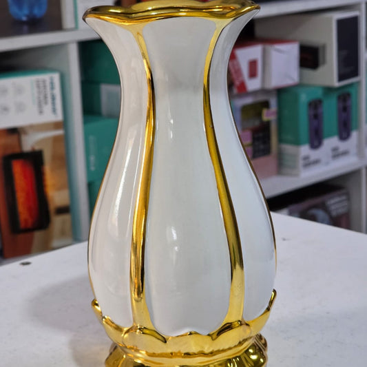 Description Infuse your space with luck and affluence with this distinctive ceramic vase, creatively shaped to resemble a cinched money bag or fortune sack. The vase features a high-gloss white, textured body contrasted beautifully by polished gold plating on the rim, base, and the decorative tie that gathers the mouth...