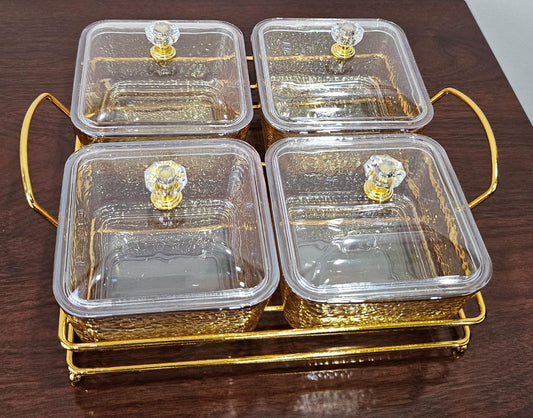 Elevate your hosting with this exquisite 4-slot glass serving dish set, perfect for presenting everything from sweets and sugar to nuts and condiments. The set features four individual square glass canisters (200ml each) nestled securely within a stunning golden hammered-texture frame that includes convenient side carrying handles. Each canister is...