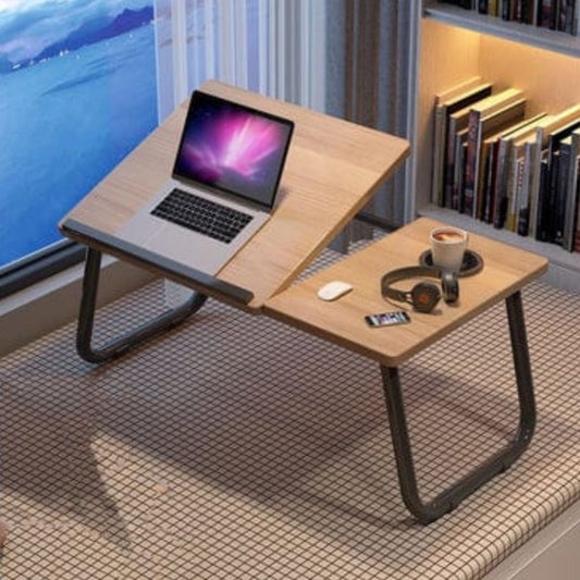 Description This portable wooden desk provides a functional workspace for individuals who enjoy working or studying from the comfort of a bed or sofa. The surface features a dual panel design where the primary section tilts to offer five distinct viewing angles while the secondary panel remains flat for accessories....