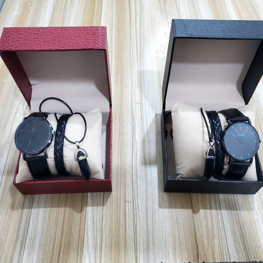 Description This coordinated men's accessory set features a matching timepiece and two supplementary jewelry items designed to provide a complete look. The set includes a minimalist wristwatch with a dark face and thin markers, paired with a braided faux leather bracelet and a stone pendant necklace. Each collection is displayed...