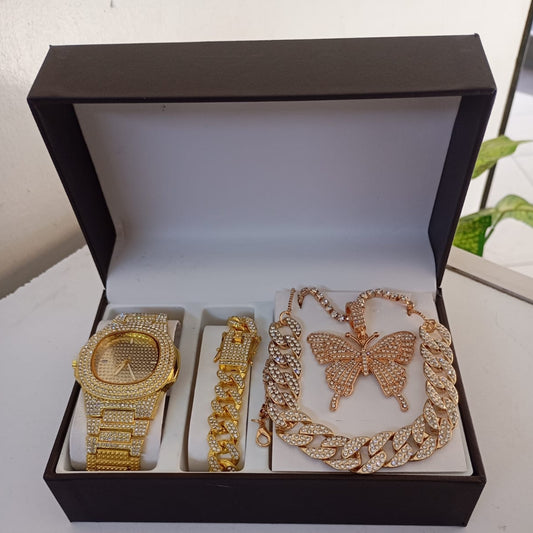 Description This four piece jewelry collection offers a coordinated look for special events or daily wear. The set includes a watch with a decorative stone encrusted face, a matching bracelet, a chunky link chain, and a large butterfly pendant necklace. Each piece is covered in shimmering accents to catch the...