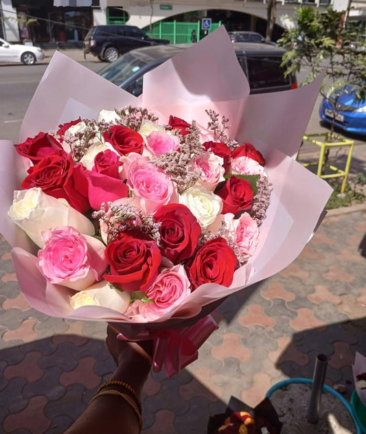 This beautiful bouquet features a fresh, hand-tied assortment of premium quality roses in rich, vibrant colors. The arrangement typically includes a mix of deep red, bright pink, and pure white roses, accented with subtle filler flowers, and elegantly wrapped in complementary paper. This classic and romantic gift is perfect for...