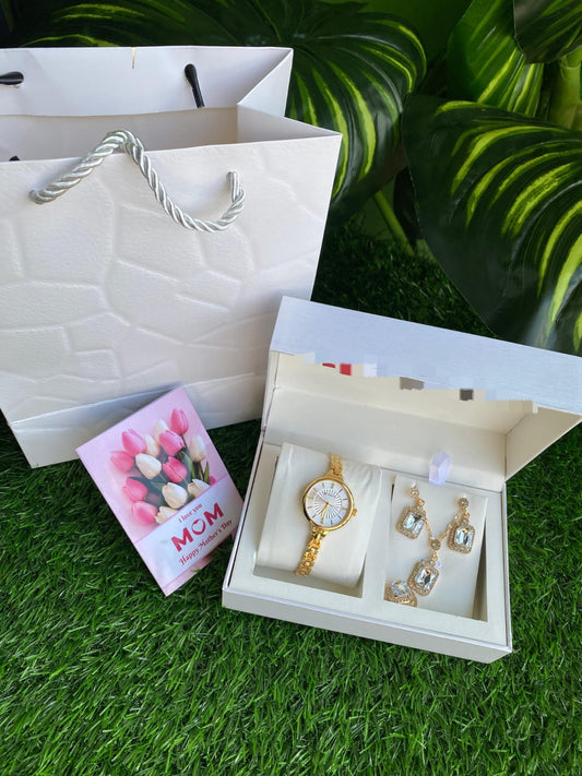 This elegant 4-in-1 gift set is the perfect present to celebrate Mother's Day or any special occasion. It includes a coordinated collection of sophisticated accessories presented in a beautiful package ready for gifting. The set features a gold-tone watch, matching earrings, and a ring with striking black details. This thoughtful...