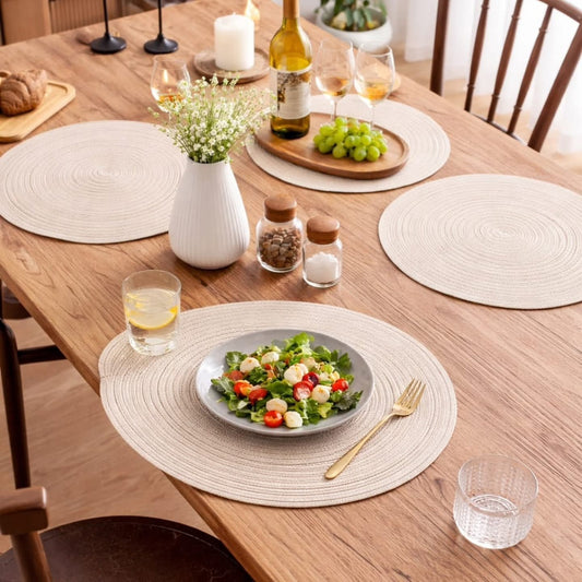 6 Piece Round Woven Placemat Set This set of six circular placemats provides a practical way to organize your dining space while protecting your table surface from heat and spills. Each piece is crafted with a woven texture that adds visual interest to meal times and social gatherings. These mats...