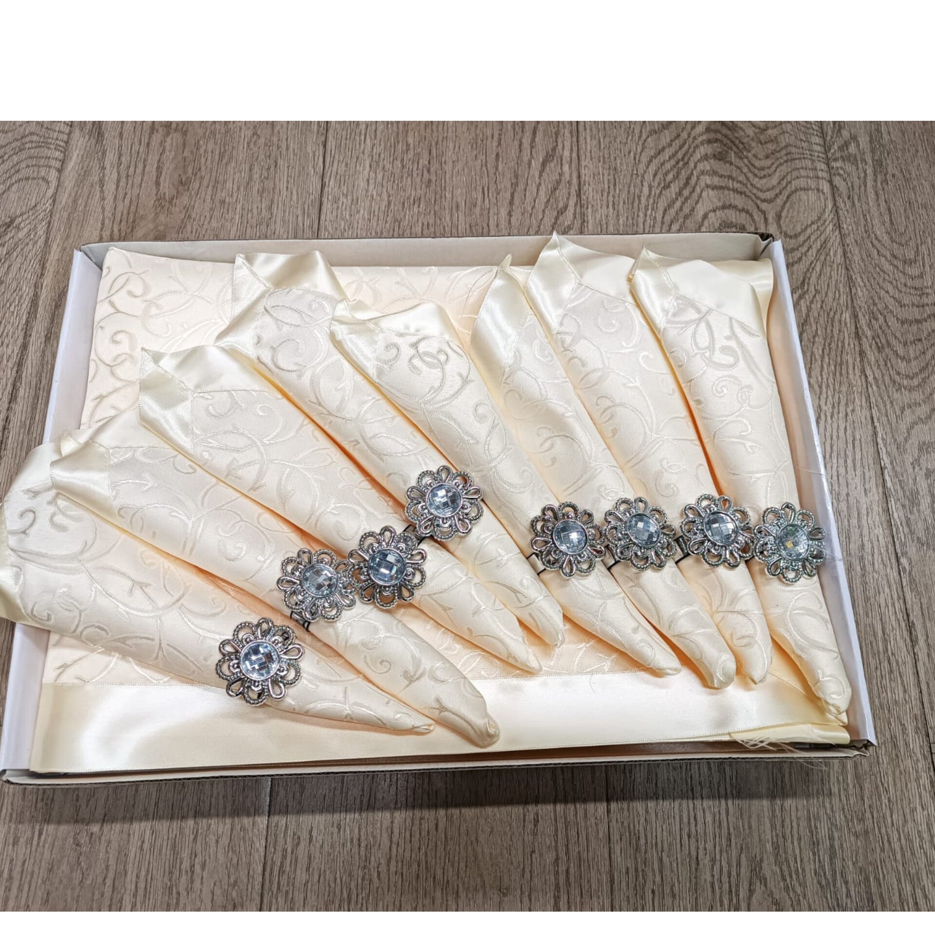 • Features eight matching jeweled napkin rings