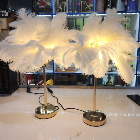Description This interior lighting accessory features a lush canopy of white feathers that gently diffuses light to create a warm and inviting atmosphere. The slender support rod and circular base are finished in a bright gold tone to provide a stable foundation on any flat surface. An integrated LED light...