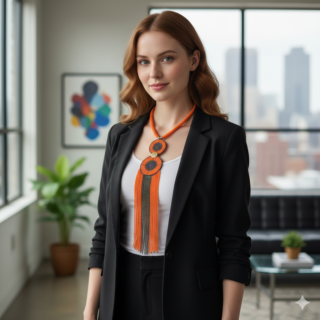 This exquisite piece is a handcrafted long beaded necklace, a celebration of traditional Maasai artistry from East Africa. It features a prominent pendant crafted from meticulously strung, vibrant glass beads, which are attached to a stout beaded choker. The centerpiece is distinguished by two large, concentric beaded circles and long, flowing multi-strand tassels. This stylish and culturally rich accessory is designed to make a bold statement, representing identity and the intricate craftsmanship of the Maasai people.