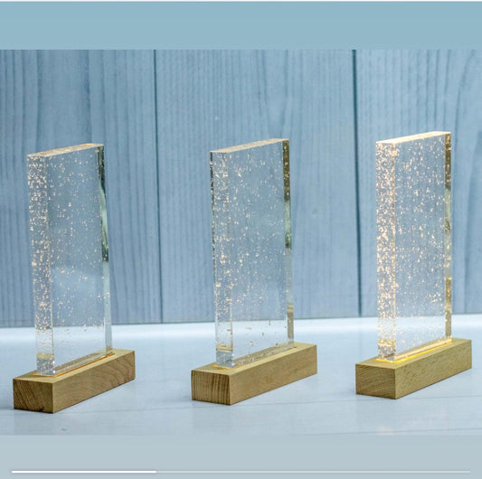 This striking crystal award features a clear rectangular prism embedded with shimmering bubbles, creating a mesmerizing visual effect when illuminated. The internal LED lighting system highlights the exquisite crystal structure, symbolizing achievement and inspiration. It is mounted on a stylish, solid wood base that provides a stable foundation and a...