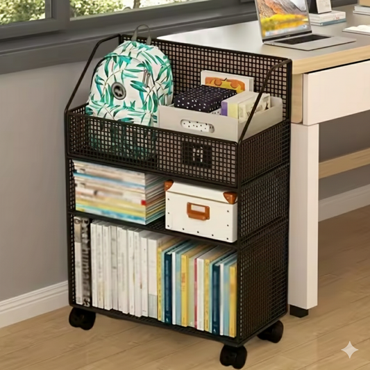 3-Tier Rolling Bookshelf storage with a rack This 3-Tier Rolling Utility Cart is the perfect organizational companion for any office, dorm room, or small living space. Constructed from durable metal mesh with a clean white or sleek black finish, this stand features two lower flat shelves ideal for stacking books...