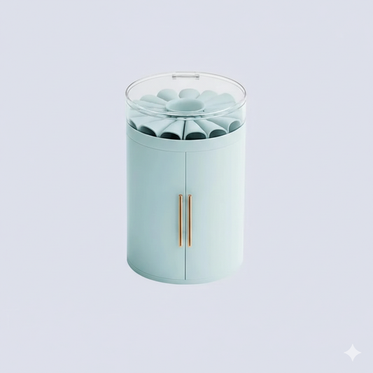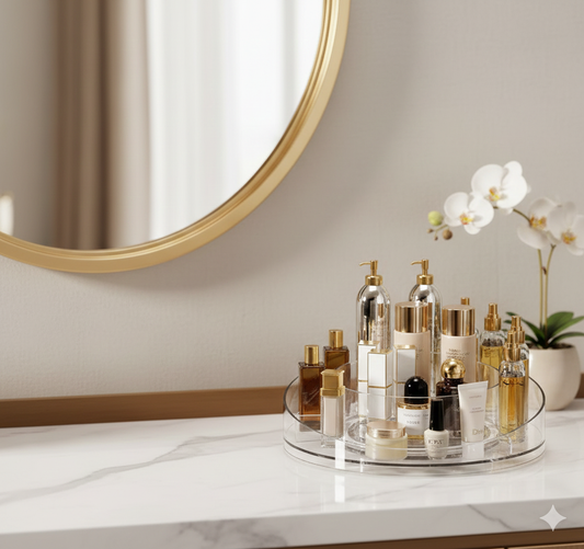 Description This elegant rotating cosmetic organizer is a sophisticated storage solution designed to streamline your daily beauty routine by providing seamless access to all your skincare and makeup essentials. Crafted with a cut aesthetic, the organizer features a tiered structure that maximizes vertical space on your vanity or dressing table...