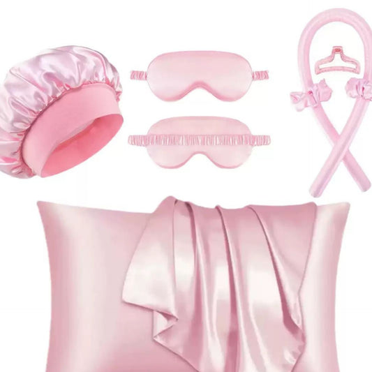 Description This comprehensive collection provides essential items for maintaining hair health and skin comfort during rest. The set includes a smooth pillowcase that minimizes friction to prevent hair breakage and skin irritation while you sleep. A matching eye mask blocks out light to support deeper relaxation, and a heatless curling...