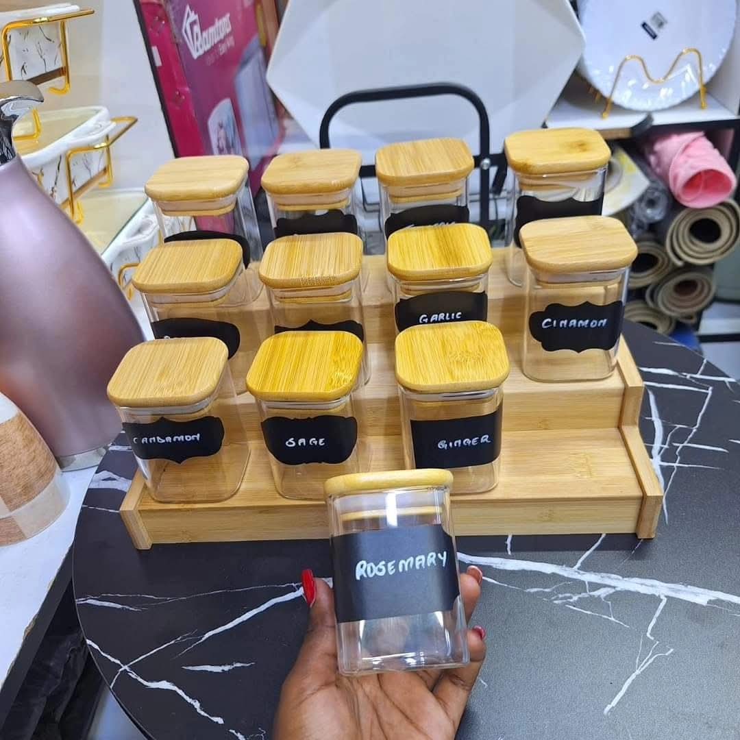 12pc square glass spice jar set with a wooden bamboo stand Ksh 5995/-