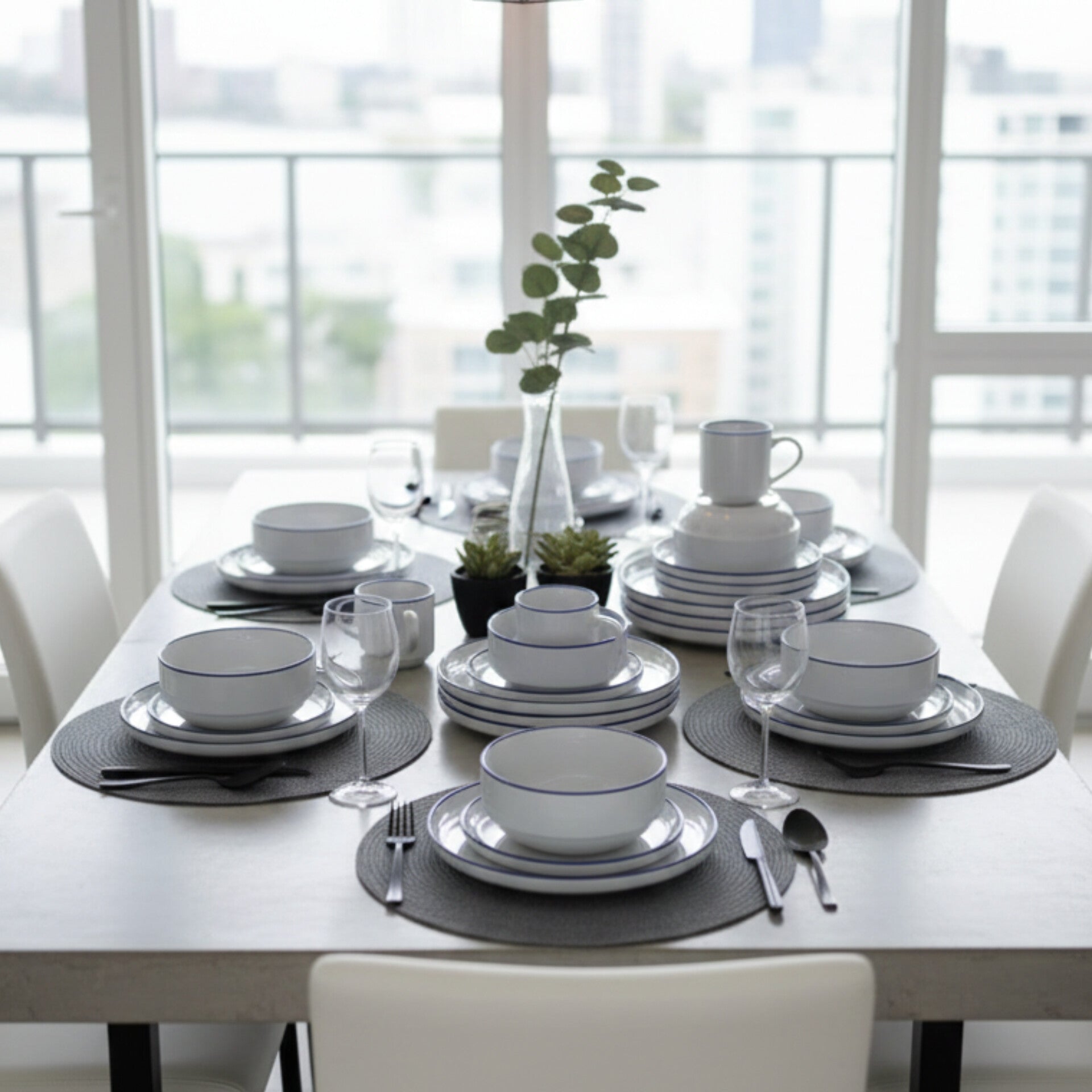 Enhance your dining experience with this elegant ceramic dinnerware set featuring a timeless white finish and a blue rim. This collection is designed to bring a clean and modern aesthetic to your kitchen while offering the durability needed for daily use. Whether you are hosting a formal dinner party or enjoying a quiet family meal, these pieces provide a versatile backdrop for any culinary creation. The high quality ceramic construction ensures longevity and a premium feel for every guest at your table.