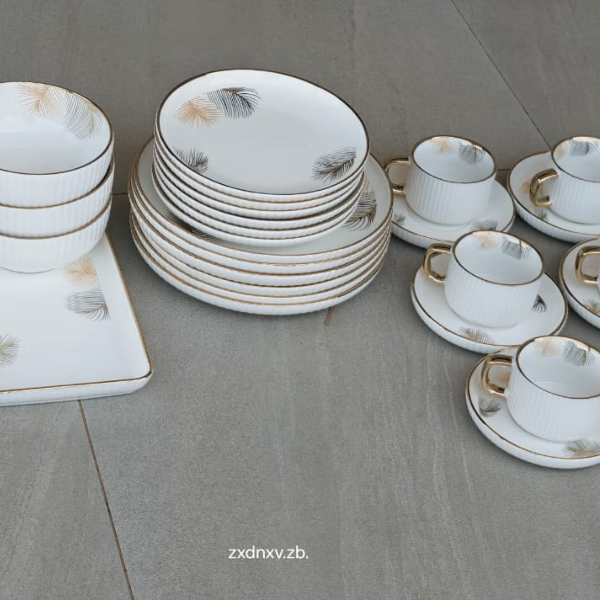This comprehensive porcelain collection provides a complete dining solution for six people. Each piece features a delicate gold and grey feather motif that adds a decorative touch to the table while maintaining a professional appearance. The set includes a variety of shapes and sizes to accommodate multi course meals from appetizers to coffee service. Durable construction ensures these items serve well for daily family meals or special gatherings. Two rectangular platters are included to facilitate the organized presentation of main dishes and sides.