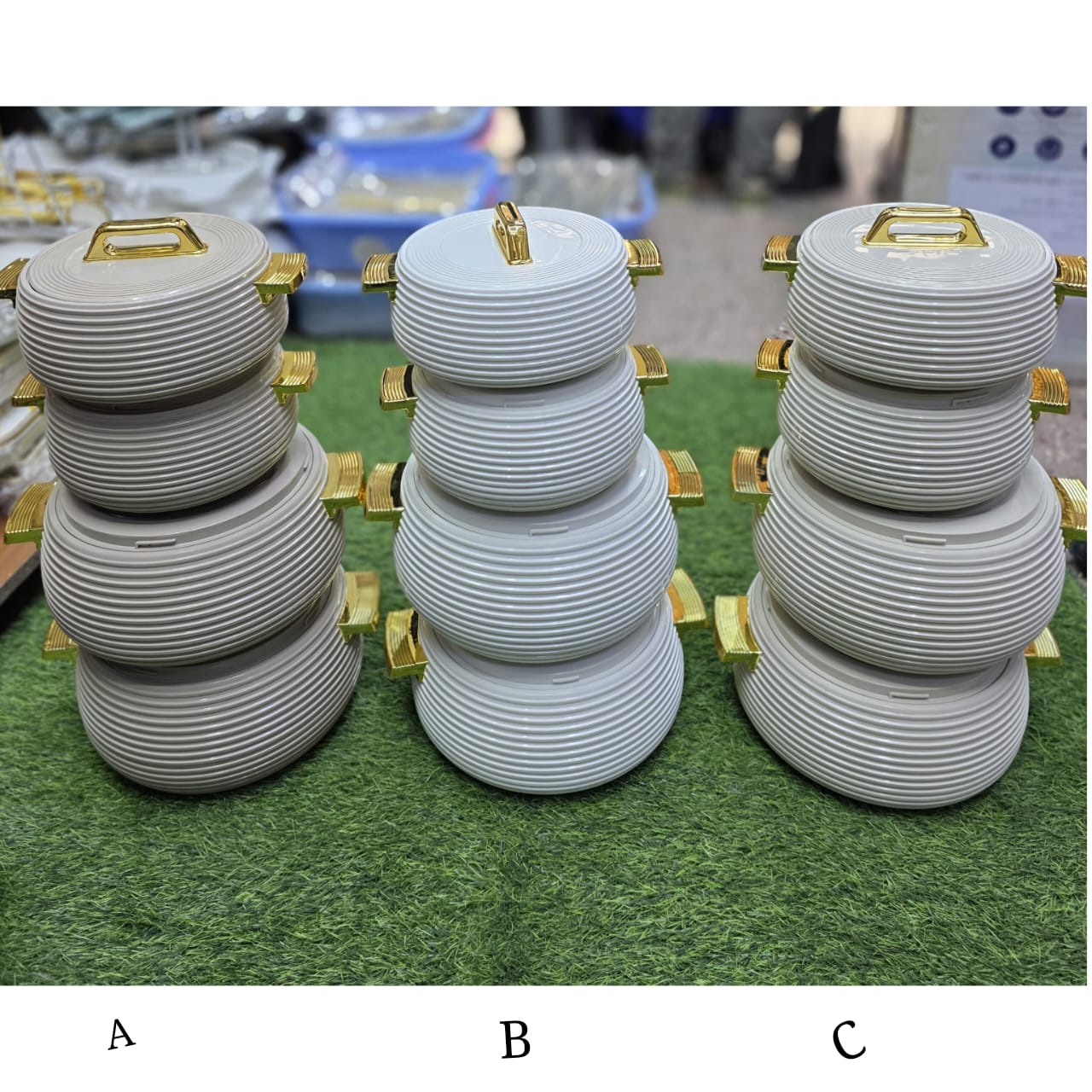 This comprehensive set of insulated hot pots is designed to keep your food at its optimal serving temperature for extended periods. The collection features four varying sizes, making it perfect for preparing, serving, and transporting meals for any occasion. The stylish exterior finish and distinctive textured design combine practicality with a pleasing aesthetic for your kitchen and dining needs.