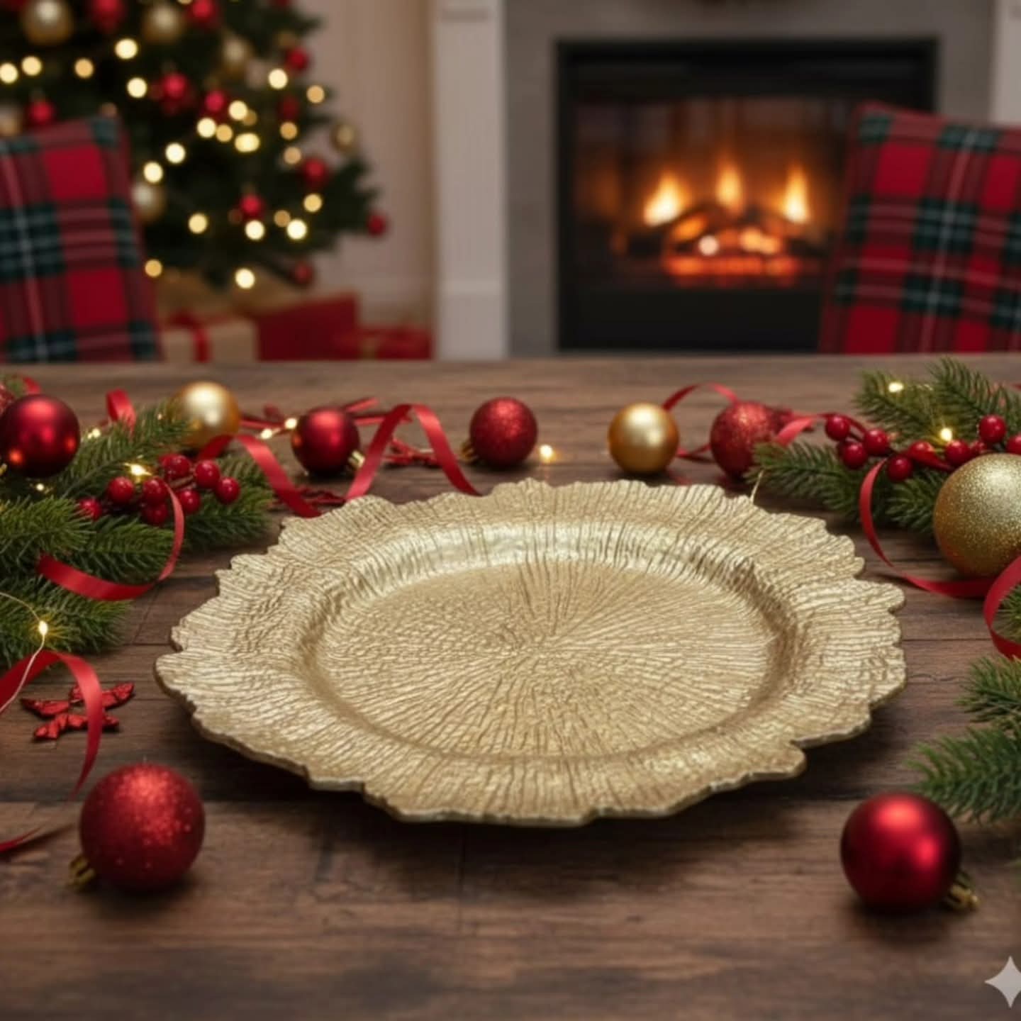 Add a touch of undeniable festive elegance to your dining experience with this set of six gold charger plates. These decorative underplates feature a stunning, organic tree bark or textured coral finish and beautifully curved edges, making them a captivating focal point for any table setting. Measuring 12 inches in diameter, they provide the perfect golden frame for your main dinnerware, instantly elevating the formality of holiday meals, weddings, anniversaries, and special events. Crafted from durable plastic, these reusable chargers offer both sophisticated style and practical protection for your valuable table linens.