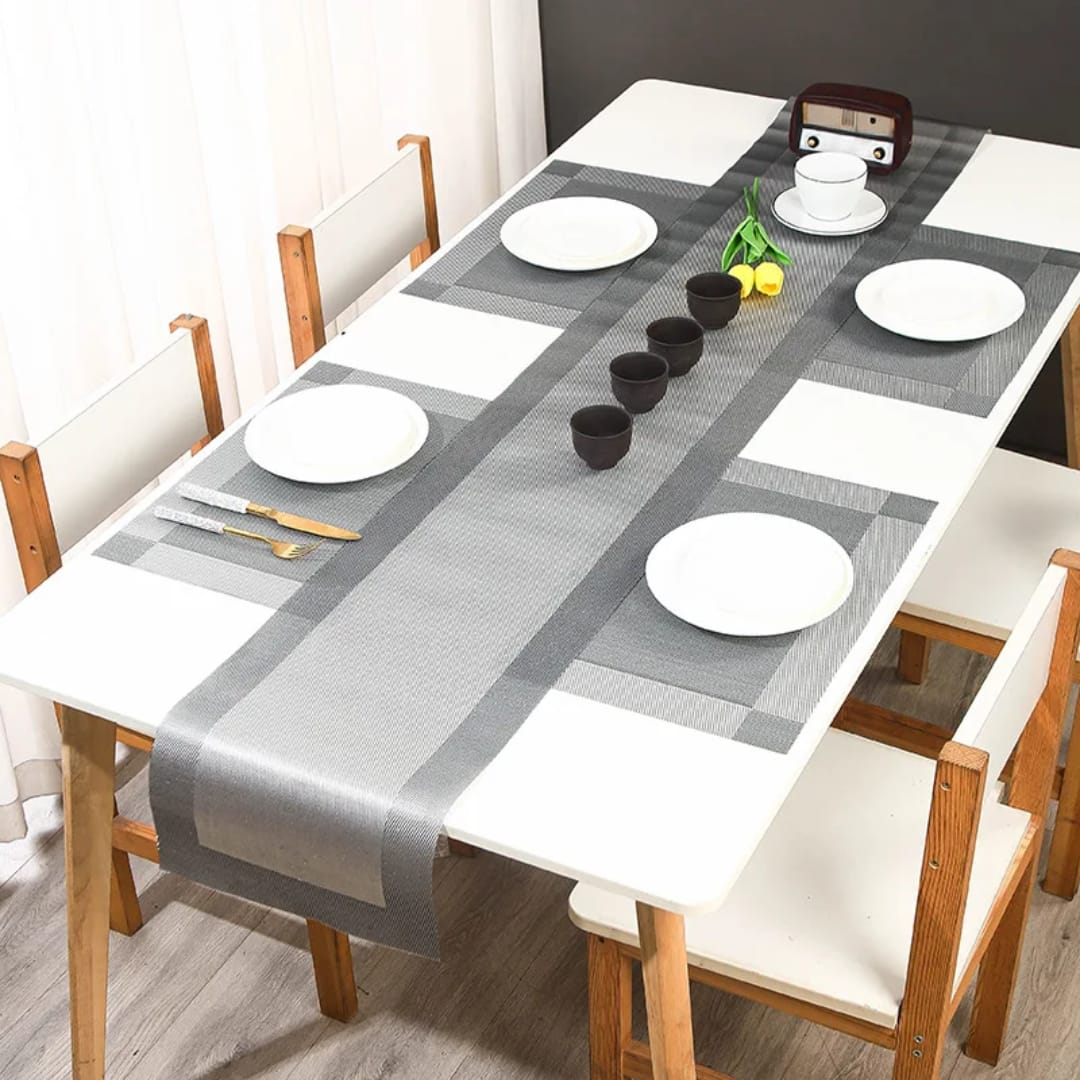 Elevate your dining table presentation and ensure protection with this complete 7-piece set, which includes one elegant table runner and six coordinating placemats. Constructed from durable, easy-to-maintain PVC material, both the runner and the mats feature a sophisticated woven pattern that adds texture and modernity to your setting. The runner measures 30cm * 180 cm making it suitable for most standard dining tables. This versatile set is perfect for both daily use and special occasions, combining practicality with contemporary style.