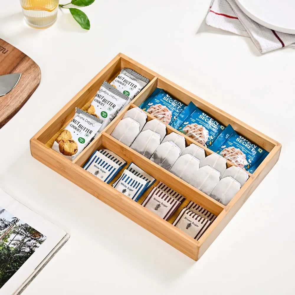 This storage solution provides a practical way to arrange various household items within drawers and trolleys. The natural wood construction offers a clean and organized appearance for any kitchen or workspace setting. Users can separate items easily using the fixed compartments to improve accessibility and order. This tray is built to fit standard modular baskets while providing a durable surface for daily use. It serves as a functional addition to keep small tools and utensils neatly in place.