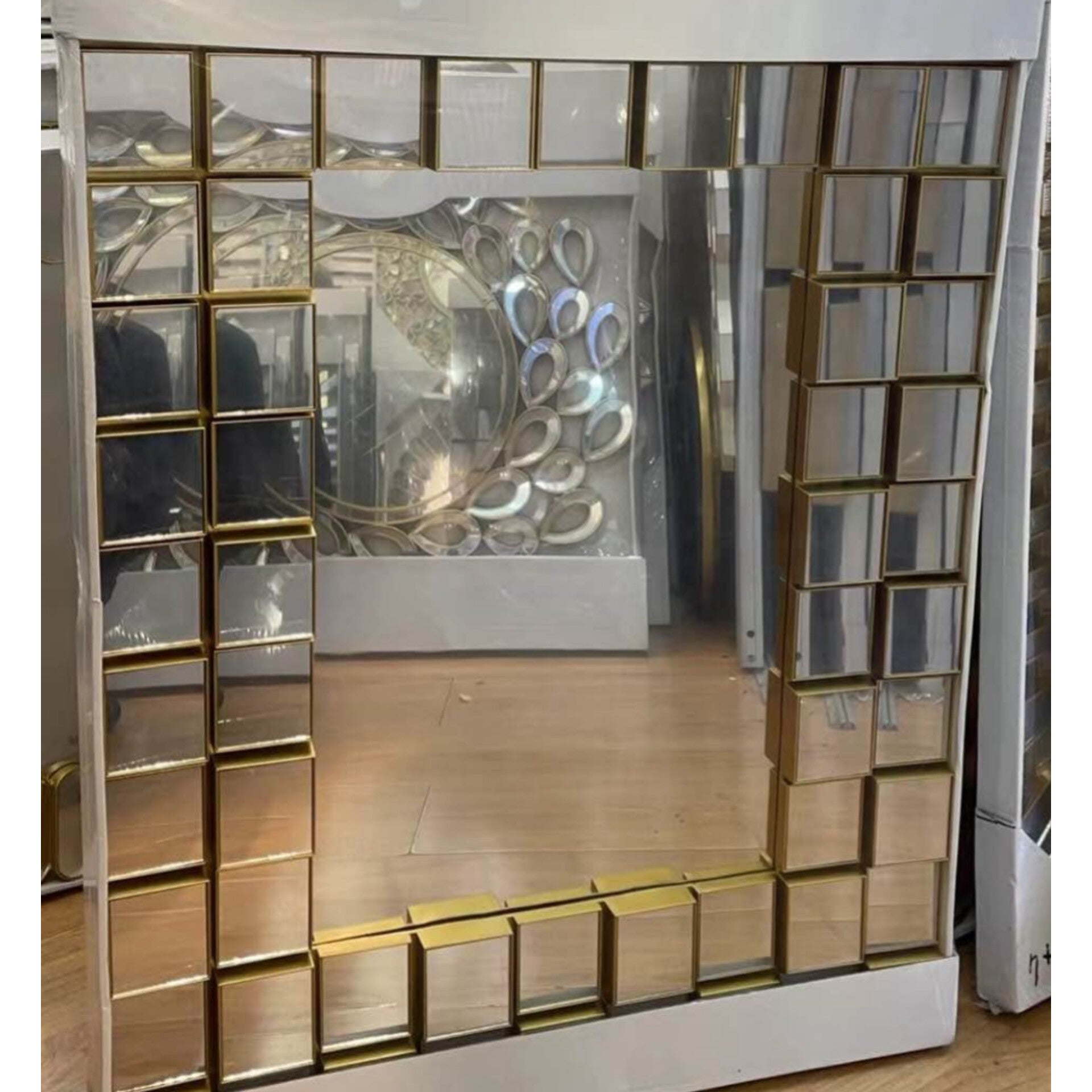 This large wall mirror features a central rectangular viewing pane surrounded by a thick border of individual raised square mirror tiles. Each tile is set within a gold colored frame that adds depth and a structured geometric pattern to the overall design. The multiple reflective surfaces work together to catch light from various angles, helping to brighten interior spaces. This piece functions as both a clear grooming tool and a bold decorative element for home walls.