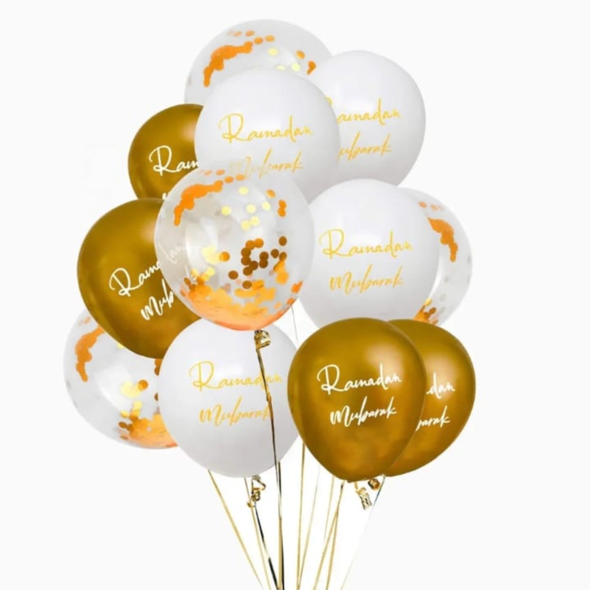 Twelve decorative balloons in white and gold colors