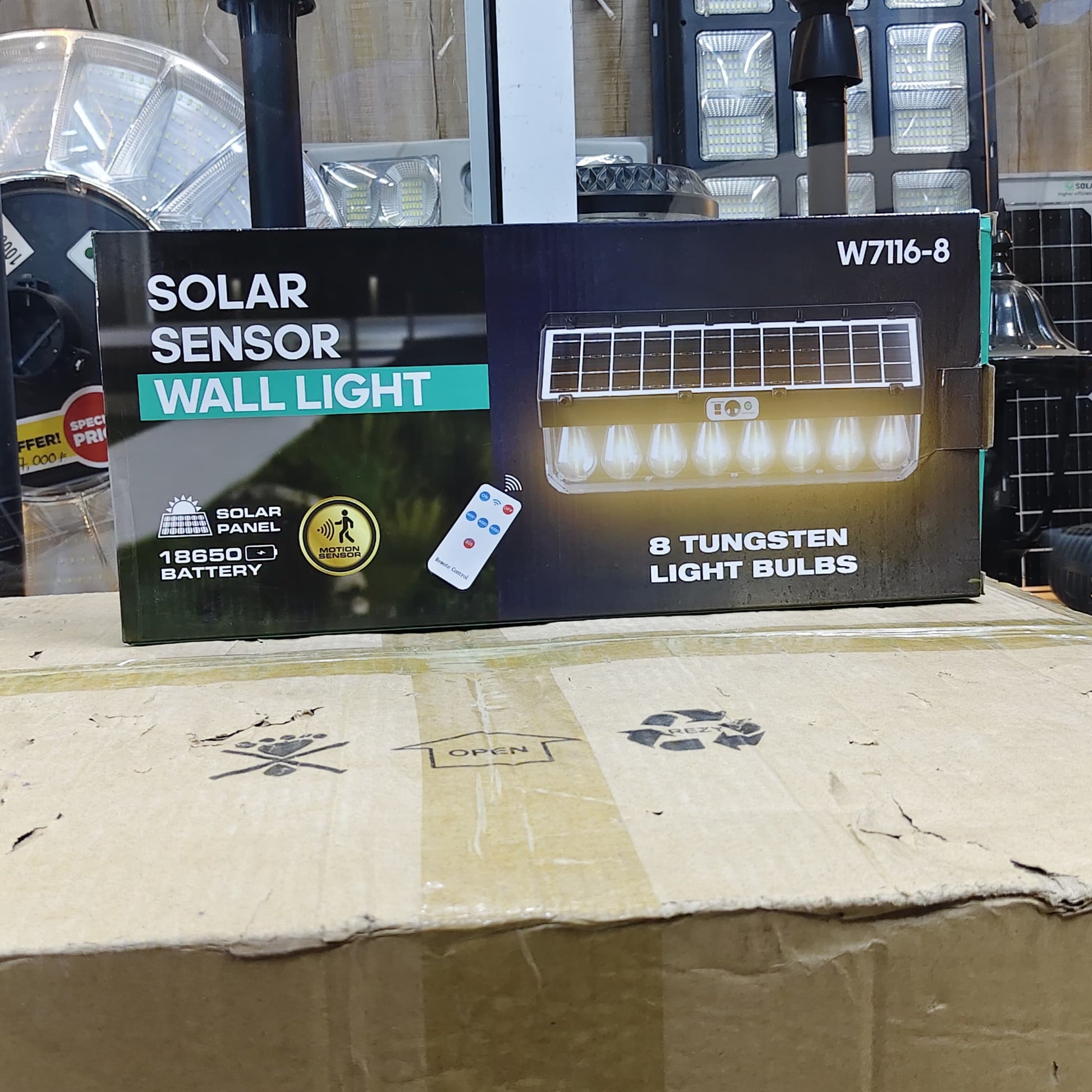 This outdoor lighting fixture uses solar power to provide constant illumination for your home exterior without increasing energy costs. The unit is equipped with eight integrated bulbs that produce a warm white light to improve visibility around walkways, entrances, and gardens. A built in motion sensor automatically activates the light when movement is detected, while an intelligent dusk to dawn sensor manages daily power cycles. The system includes replaceable batteries to ensure long term functionality and easy maintenance over time. This durable wall light offers a practical security solution for any outdoor space requiring reliable and automatic lighting.