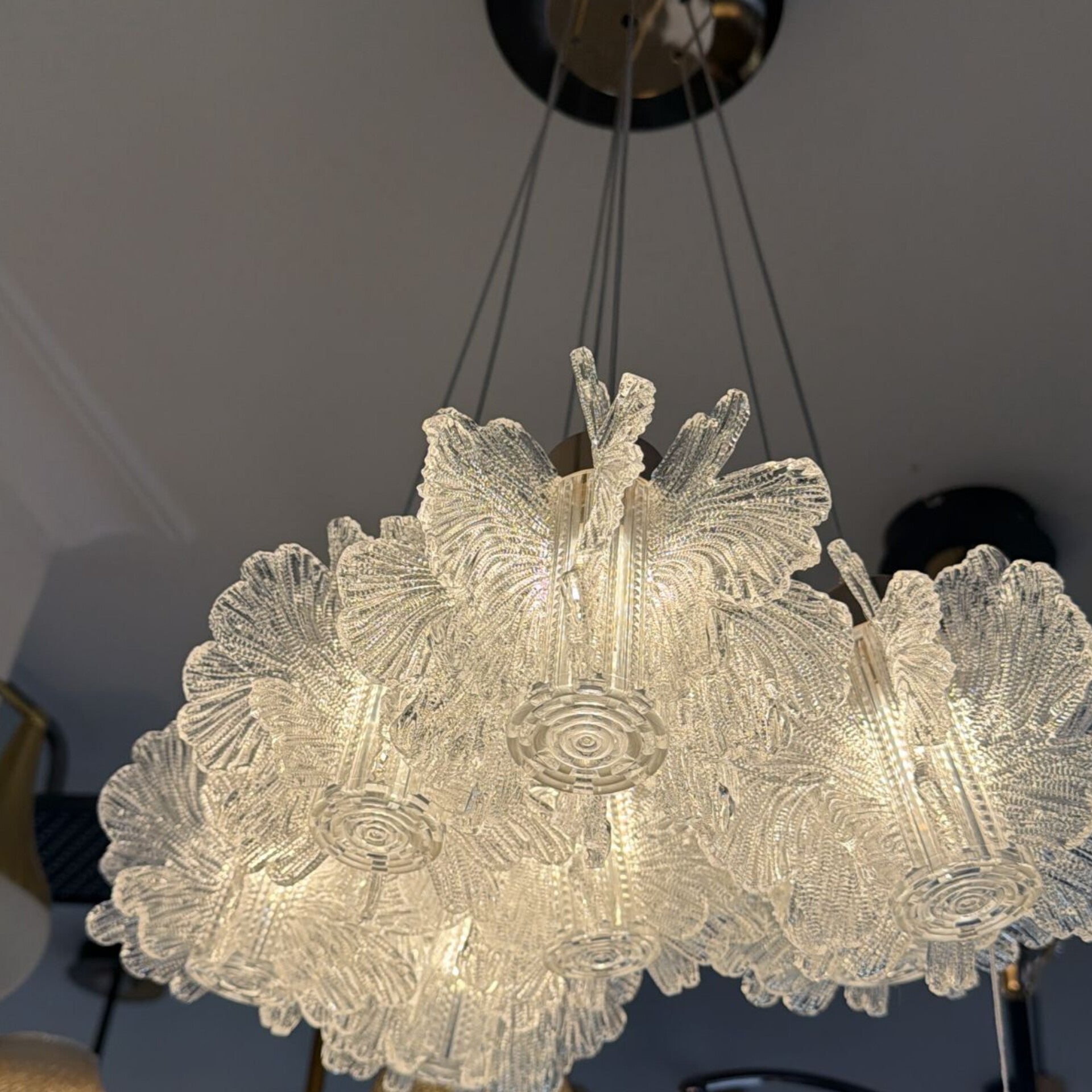 This ceiling fixture features multiple light sources encased in textured glass shades shaped like organic petals. The clear glass elements are designed with intricate patterns that diffuse light across the room while creating a focal point in any interior space. Thin adjustable cables support the cluster from a polished circular mounting plate to provide a clean and organized appearance. This chandelier offers bright illumination suitable for large rooms while adding a unique sculptural element to the ceiling.