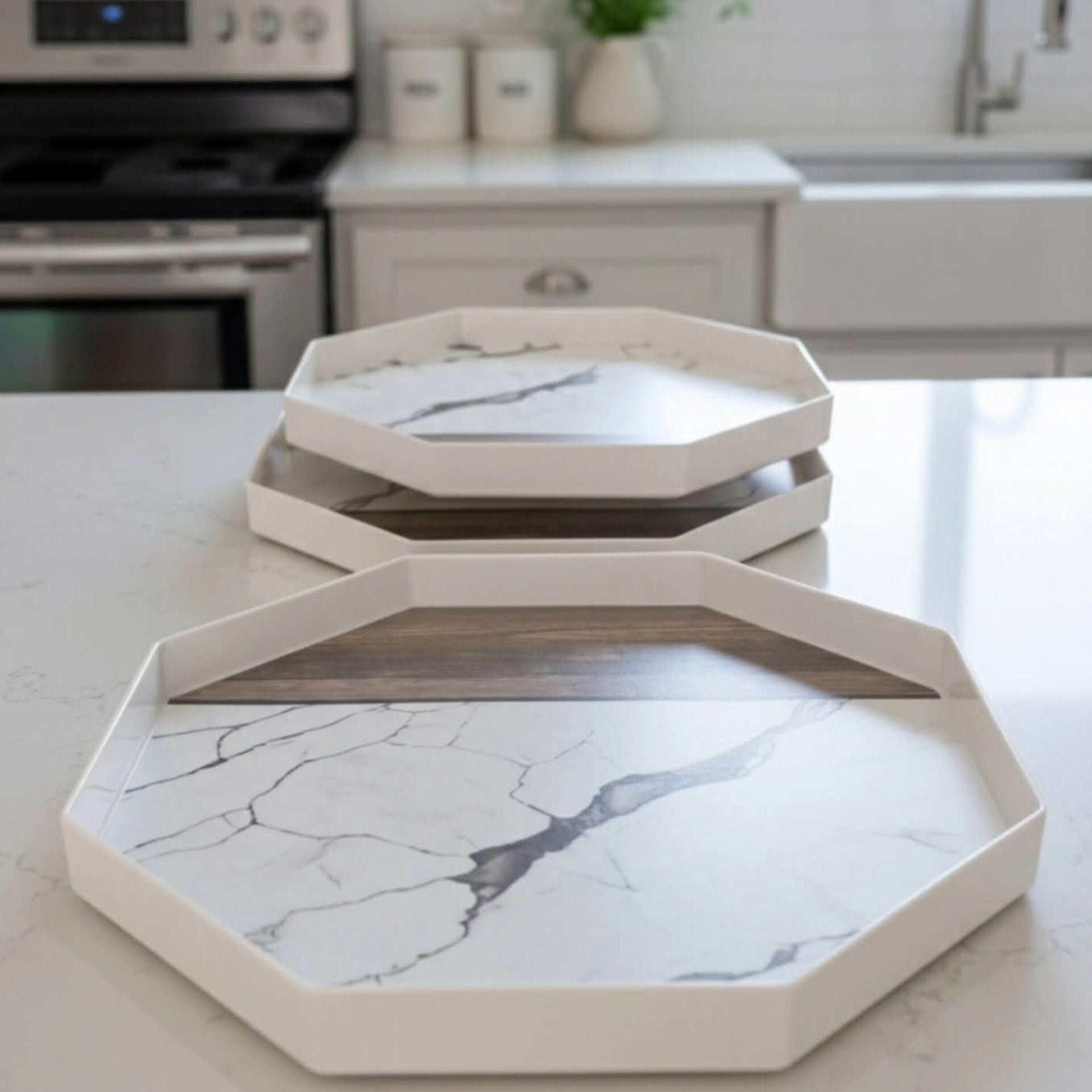 Present your appetizers, beverages, or décor with sophisticated style using this unique octagonal serving tray. Crafted from durable material, this tray features a contemporary dual-section design, combining a striking white marble effect with dark, rich wood grain detailing. The geometric shape and raised edges provide both an aesthetically pleasing look and practical stability, preventing items from slipping. This versatile tray effortlessly elevates both casual gatherings and formal entertaining settings, making it a must-have accessory for any modern home.