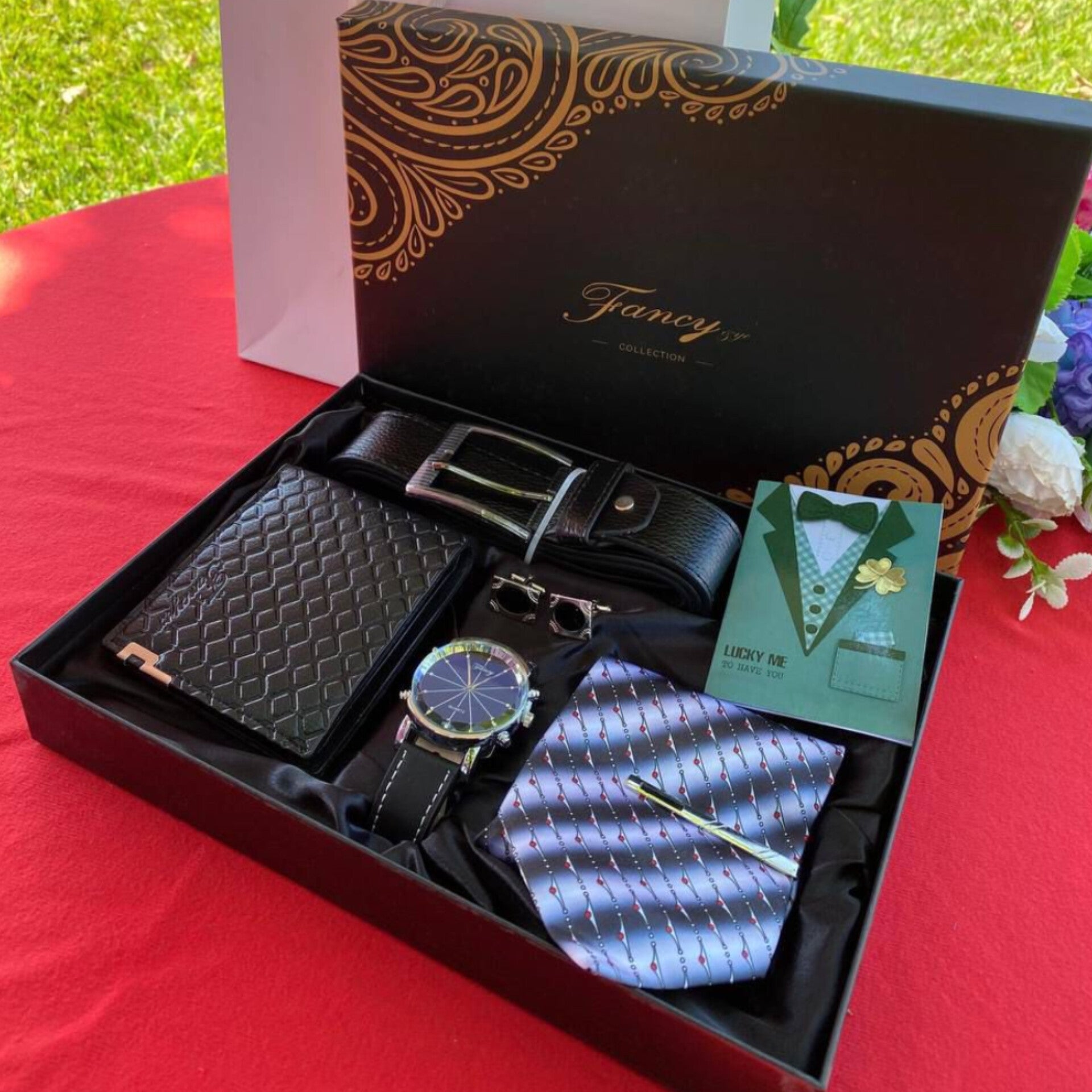 This coordinated gift set provides a complete selection of formal accessories designed to enhance a professional wardrobe. The collection includes a black leather belt with a metal buckle and a matching bifold wallet featuring a textured geometric pattern. A round wrist watch with a blue sunray dial and a black strap offers a functional timepiece for daily use. To complete the formal look, the set features a patterned tie with a matching tie clip and a pair of decorative shirt cufflinks. All items are neatly presented in a black gift box lined with satin style fabric and include a themed greeting card and a blue handled gift bag for easy presentation.