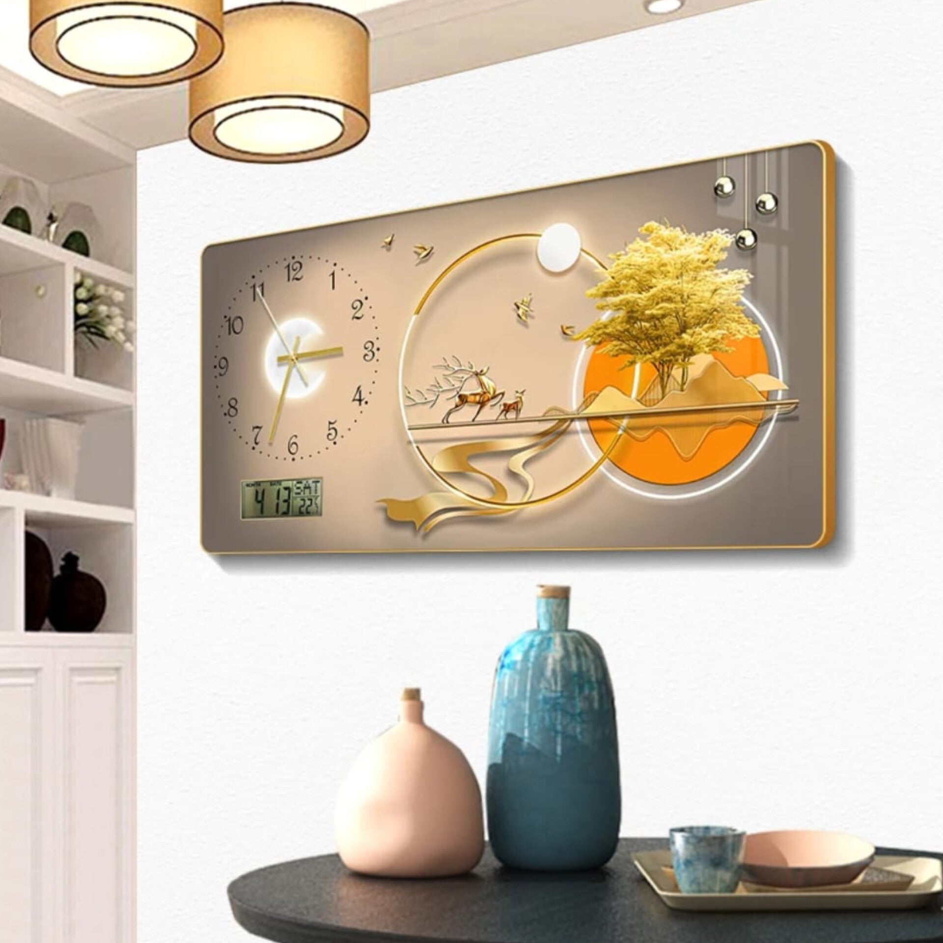 Make a sophisticated statement with this Modern Interior Wall Clock, encased in a luxurious golden frame that instantly elevates any room's décor. This piece is more than just a timekeeper; it is a contemporary work of art featuring a unique landscape design with a golden tree and deer motif. Combining traditional analog hands with a functional digital date and temperature display, this clock offers both aesthetic appeal and practical utility for the modern home or office.