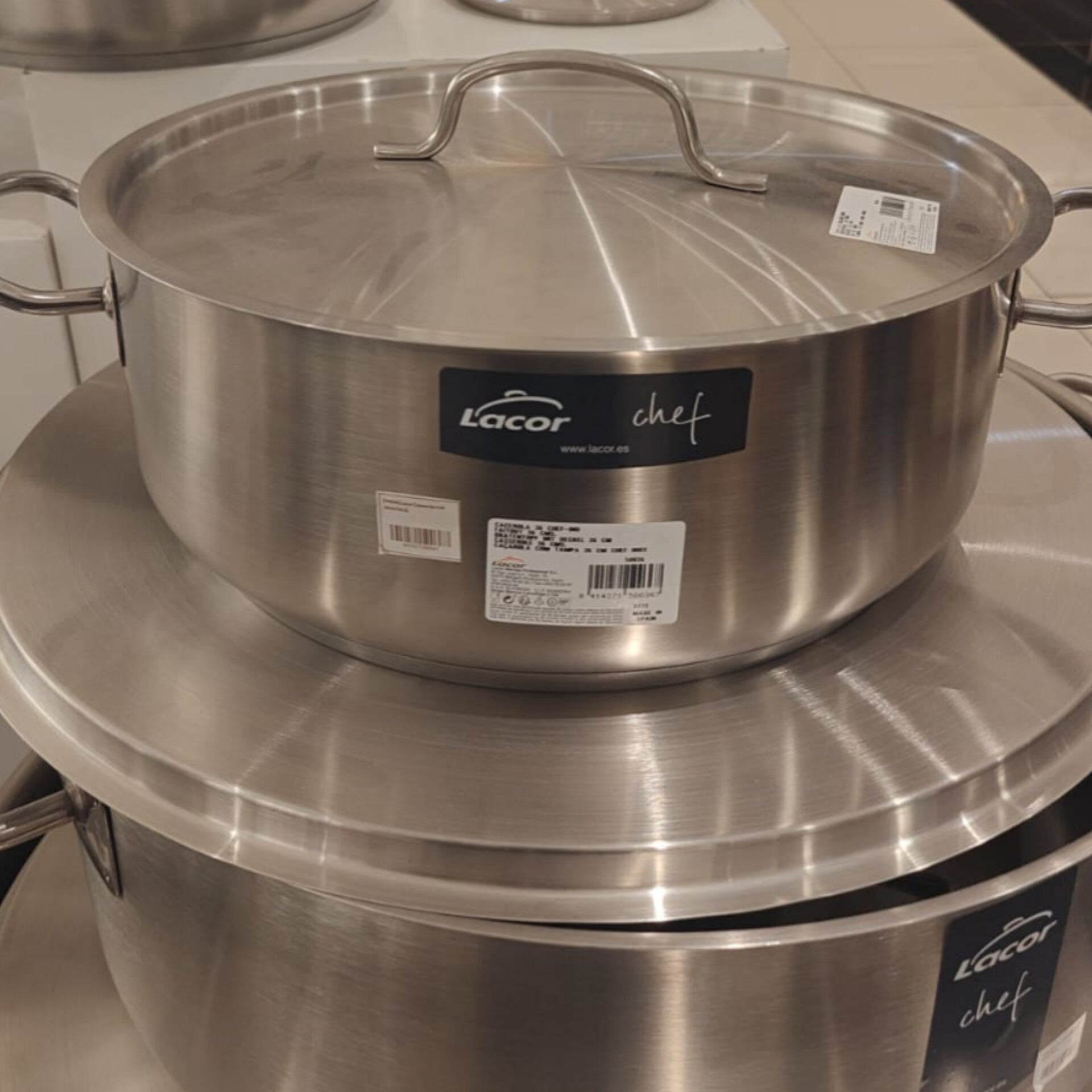 This wide diameter casserole pot is built for professional kitchen environments and demanding home cooking tasks. The vessel is constructed from heavy duty stainless steel to ensure even heat distribution across the base for consistent results. It features a 36 centimeter width and a shorter body height compared to standard stockpots, making it suitable for braising meats or reduction sauces. The pot includes two securely attached side handles for stable movement and a matching flat lid with a central handle to lock in heat. Its polished metallic surface is designed for long term durability and remains simple to maintain after frequent use.